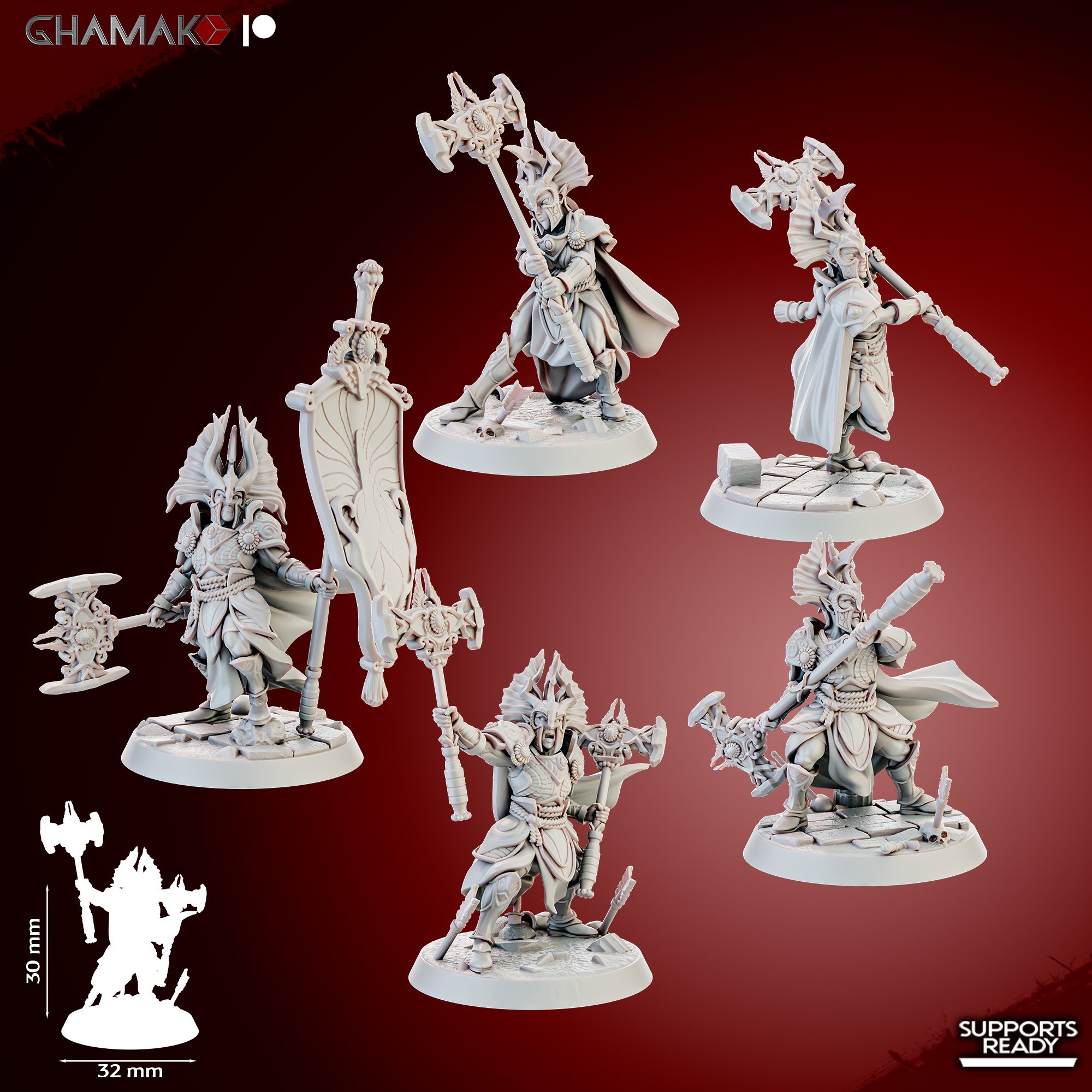 14k resin printed miniatures in 32 mm scale with custom bases. The miniatures require painting and assembly (use cyanoacrylate superglue only).